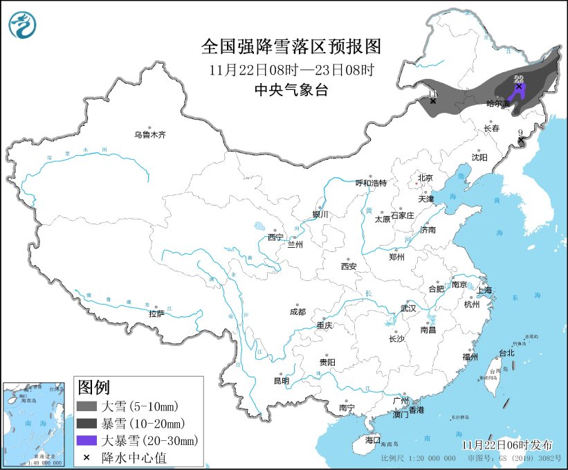 预计,11月22日08时至11月23日08时,内蒙古东部、黑龙江中东部、吉林北部和长白山区等地的部分地区有大到暴雪,其中,黑龙江中部局地有大暴雪(20~22毫米);上述地区新增积雪深度6~12厘米,局地可达16厘米以上。中央气象台11月22日06时继续发布暴雪黄色预警(见图4)。