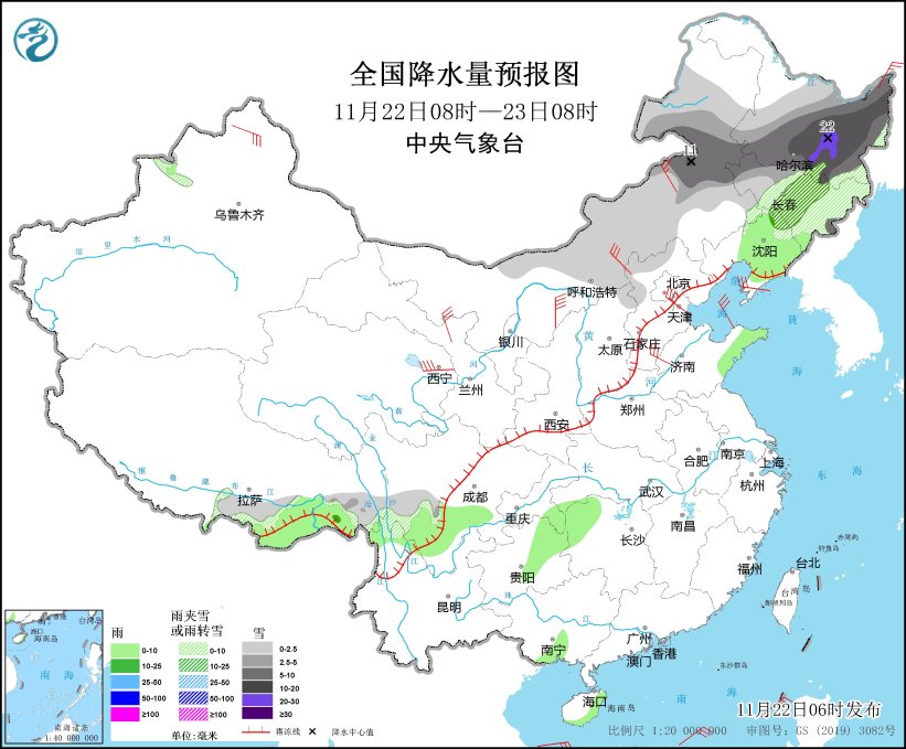 11月22日08时至23日08时,内蒙古中东部、东北地区中北部等地部分地区有小到中雪或雨夹雪,其中,内蒙古东部、黑龙江中南部、吉林东部等地部分地区有大到暴雪,局地大暴雪(20~22毫米)。辽宁中南部、黄淮东部等地部分地区有小雨。新疆东部、西部地区中东部、内蒙古大部、华北、辽东半岛、黄淮等地部分地区有4~6级风,其中,内蒙古中西部等地部分地区有6~7级风(见图5)。