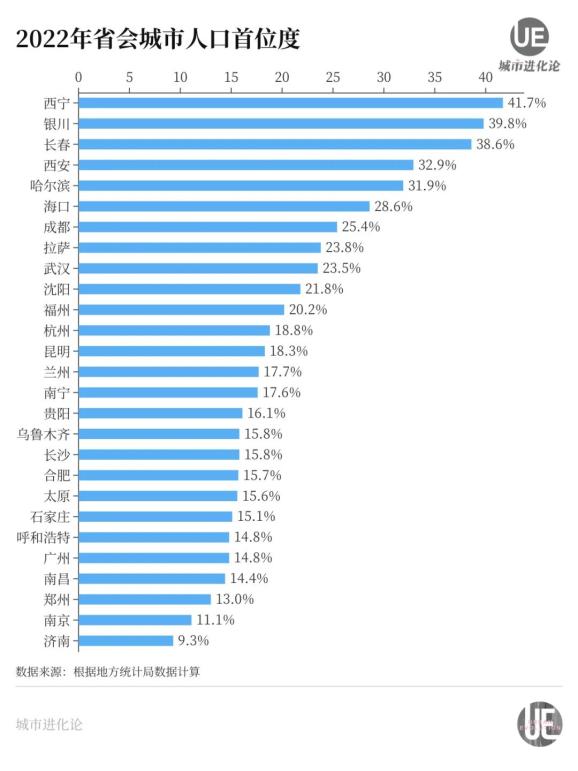 以2022年人口数据来看,有11个省会城市的人口集中度超过了20%,其中西宁聚集了全省41.7%的人口,排在第一。