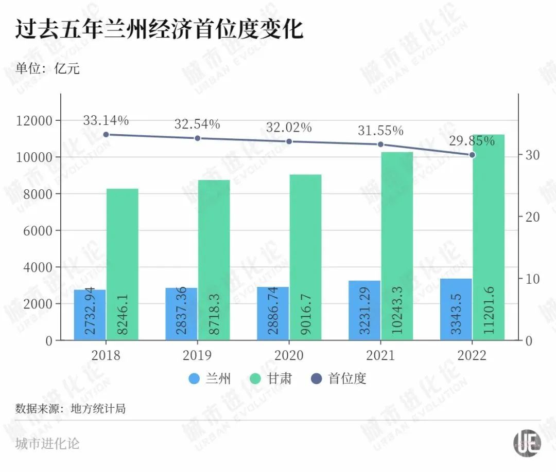 若在西北五省份之间比较,兰州的经济首位度不算高,29.8%的比重,排在银川(50%)、西宁(45.5%)、西安(35%)之后。且兰州的经济首位度,相较前两年也有所下滑。