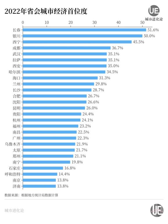 以经济首位度来衡量省会城市的强弱程度,一般来说,30%是基准线,超过30%被认为是强省会的标志。