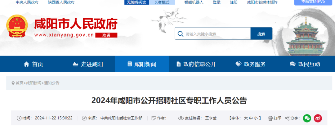 2.发布渠道:《2024年咸阳市公开招聘社区专职工作人员公告》在咸阳市人民政府网(https://xianyang.gov.cn/)、咸阳党建网()发布;招聘的笔试、资格复审、面试、体检、考察、拟聘人员确定等环节的公告公示在咸阳党建网发布。