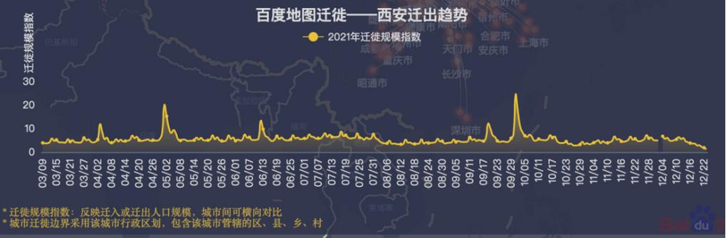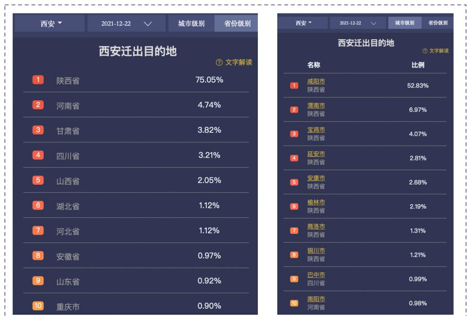12月22日,咸阳市占西安迁出人口总量的52.83%,渭南市6.97%,宝鸡市4.07%,排在前10名的城市还有延安市、安康市、榆林市、商洛市、铜川市、巴中市、南阳市。此外,18日-22日,咸阳市五日平均迁入比例平均值为50.228%。