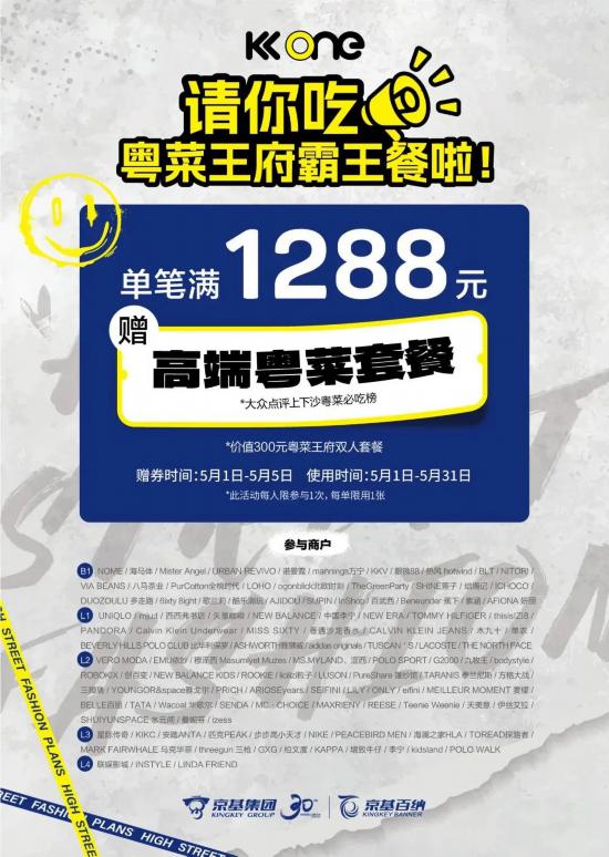 满1288赠价值300元粤菜王府双人套餐:会员于指定品牌单笔消费满1288元并积分即可获赠粤菜王府双人套餐1份,活动期间,每人可参与1次,数量有限,赠完即止。