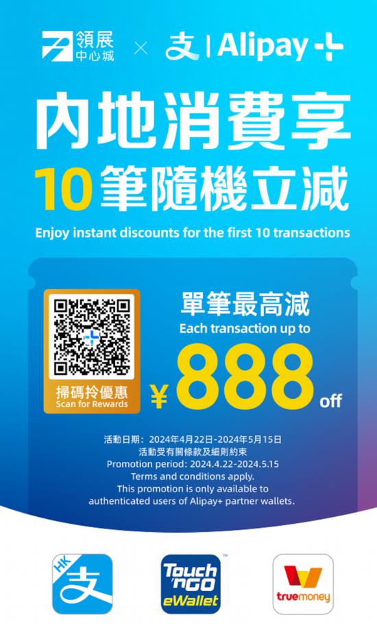 全场支持Alipay Pay HK支付,扫码立领优惠,享十笔立减,单笔最高减888元,每日限量,先到先得。