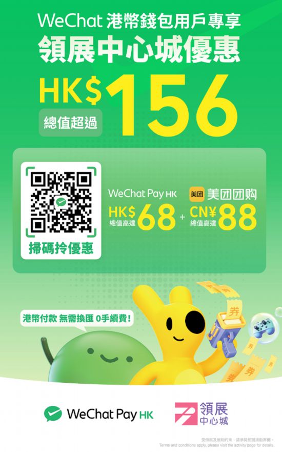 全场支持WeChat Pay HK支付,港客到店扫码最高可领 HK$156电子现金券礼包,,全场商品支付时立减,每日限量,先到先得。