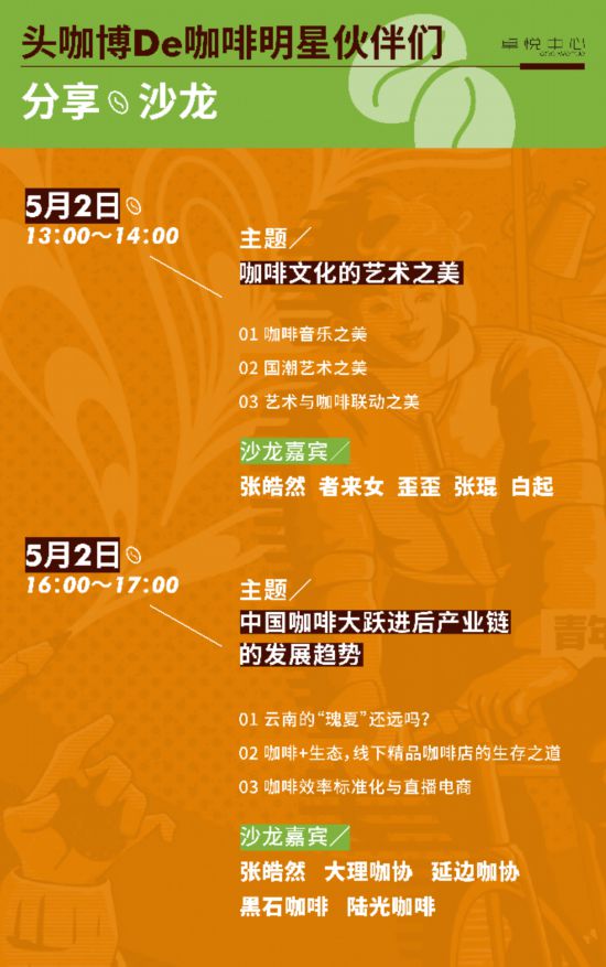 邀请国潮艺术家歪歪、世界音乐歌者来女、以及各地精品咖啡领军主理人们,带来“头咖博De咖啡明星伙伴们分享沙龙”,与大家一起分享“咖啡文化的艺术之美”、共同探讨“中国咖啡大跃进后产业链的发展趋势”,聚焦国潮、艺术、跨界联动、云南咖啡、咖啡+生态、直播电商等咖啡行业热题。