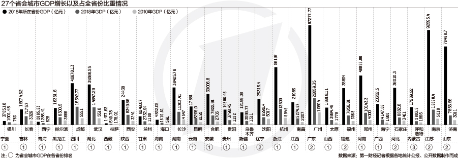根据第一财经记者统计,从2010年到2018年,省会城市占比提高的有24个城市,只有三个城市出现下降,分别是西宁、昆明和沈阳。