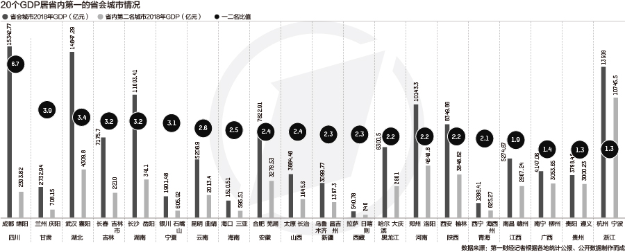 20个GDP位居全省第一的省会城市中,有4个与省内第二名城市的比值低于2。除了沿海发达省份浙江因为拥有“双子星”,杭州这一比值较低外,中西部的贵阳、南宁和南昌也都低于2。