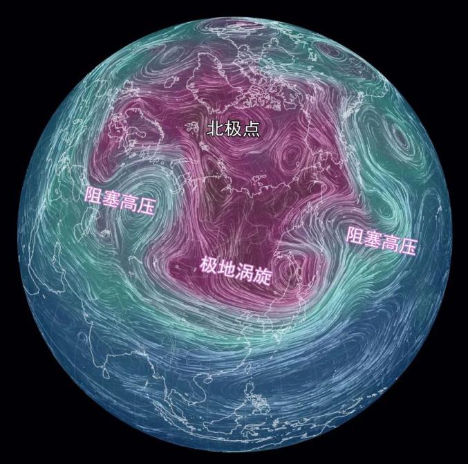 ↑上图为12月14日500hPa风场+气温示意图,最红的部分表示气温最低,差不多就是对流层极地涡旋的覆盖区域,我国位置则在图中下方偏左一点。