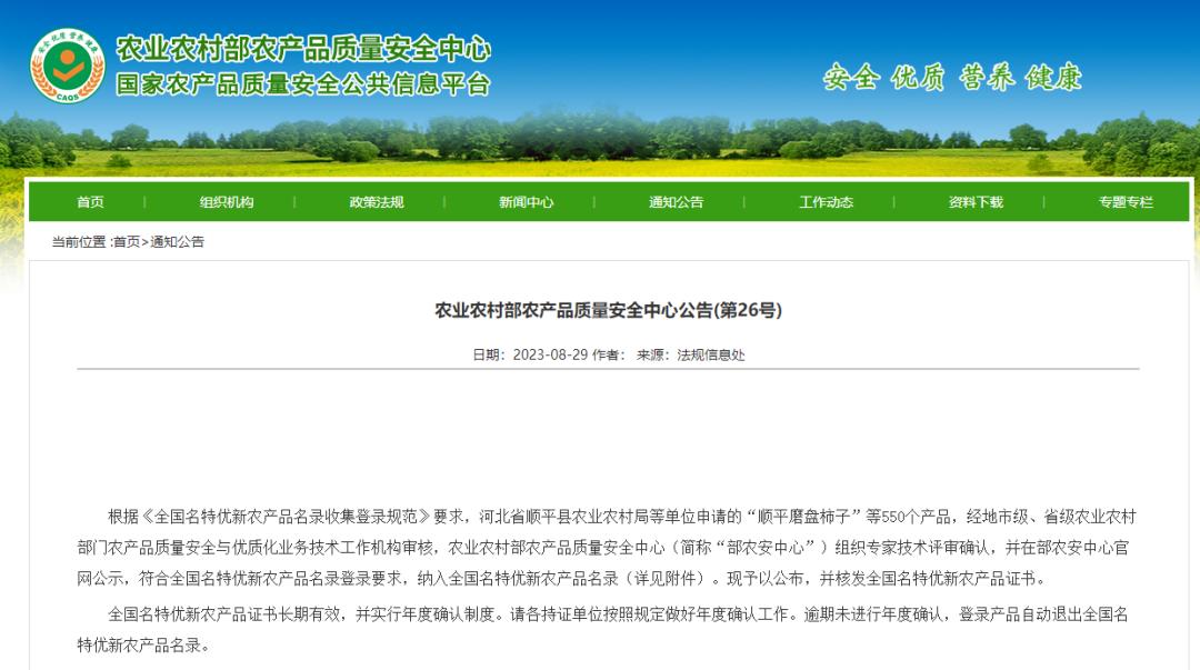 纳入到名录的550个名特优新农产品是经地市级、省级农业农村部门农产品质量安全与优质化业务技术工作机构审核,农业农村部农产品质量安全中心组织专家技术评审确认并在中心官网公示,符合全国名特优新农产品名录登录要求的农产品。这些农产品核发全国名特优新农产品证书,证书长期有效,并实行年度确认制度。逾期未进行年度确认的,登录产品自动退出全国名特优新农产品名录。