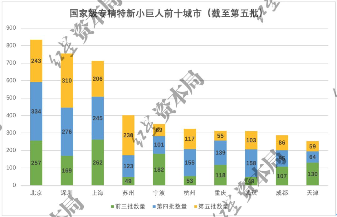 红星资本局梳理发现,第五批小巨人数量公布后,十强城市没有变化,但排名竞争却相当激烈。第五批过后,前十强城市分别是北京、深圳、上海、苏州、宁波、杭州、重庆、武汉、成都、天津。