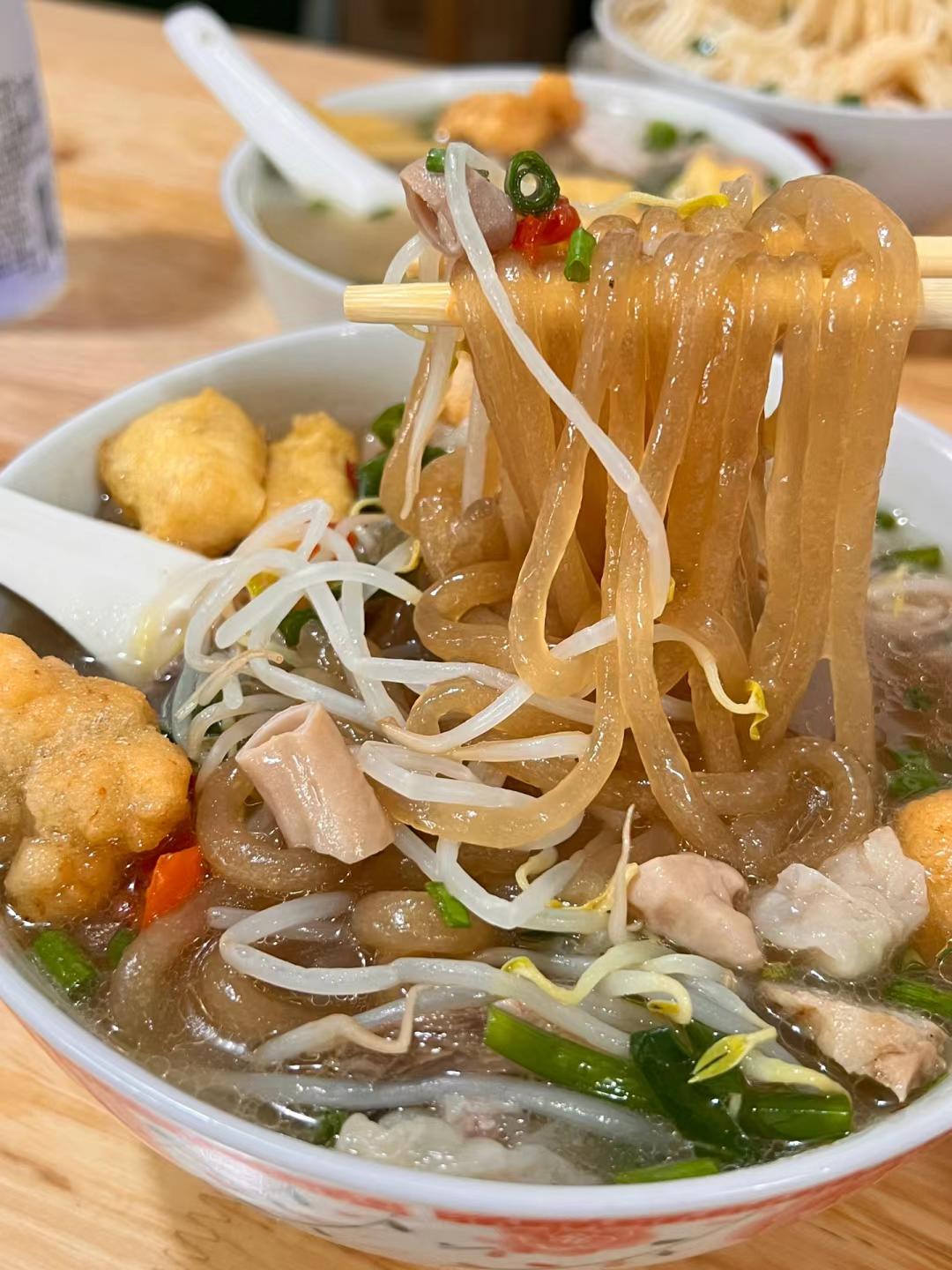点上一碗泗粉,看老板会手脚麻利地捞粉,浇汤,还会加入各种配料,最经典的莫过于豆丸,豆腐,还有小肠和酥肉等。