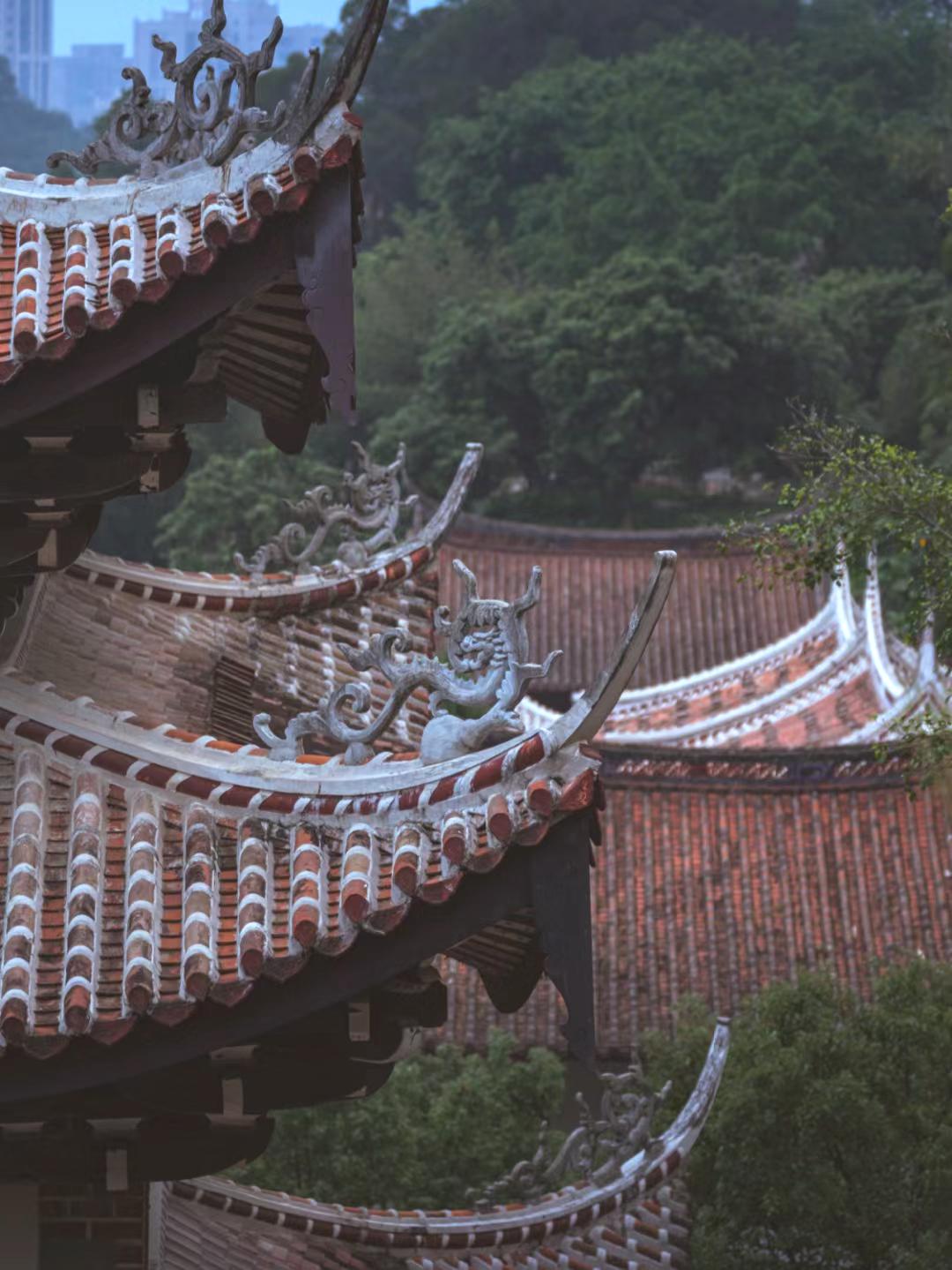 你可以漫步雕梁画栋的百柱廊庑,也可以闲逛飞檐翘角的天后殿,抬头就能望见三层八角的朝天阁……是宫殿庙宇,更似海上天境。