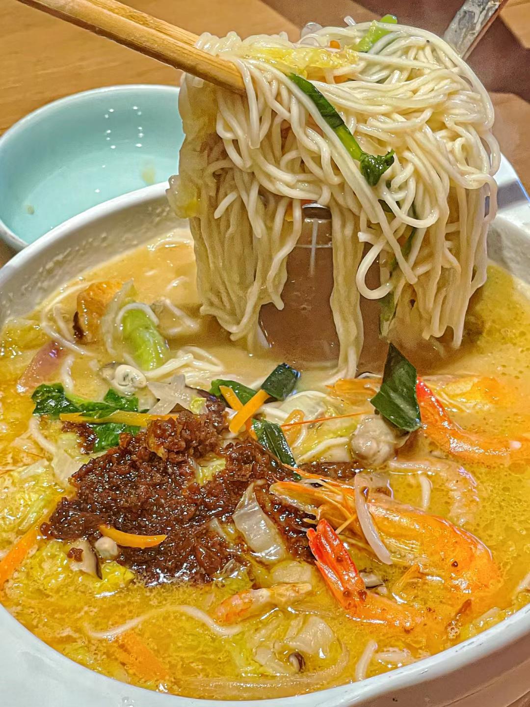 趁着热乎劲儿,大口地吃面,那柔软弹牙的细面,浸透了鲜美的汤汁,在唇齿间一寸寸漾开,更别提那脆爽的小海鲜,还会biu出汁水,简直鲜到眉毛掉!