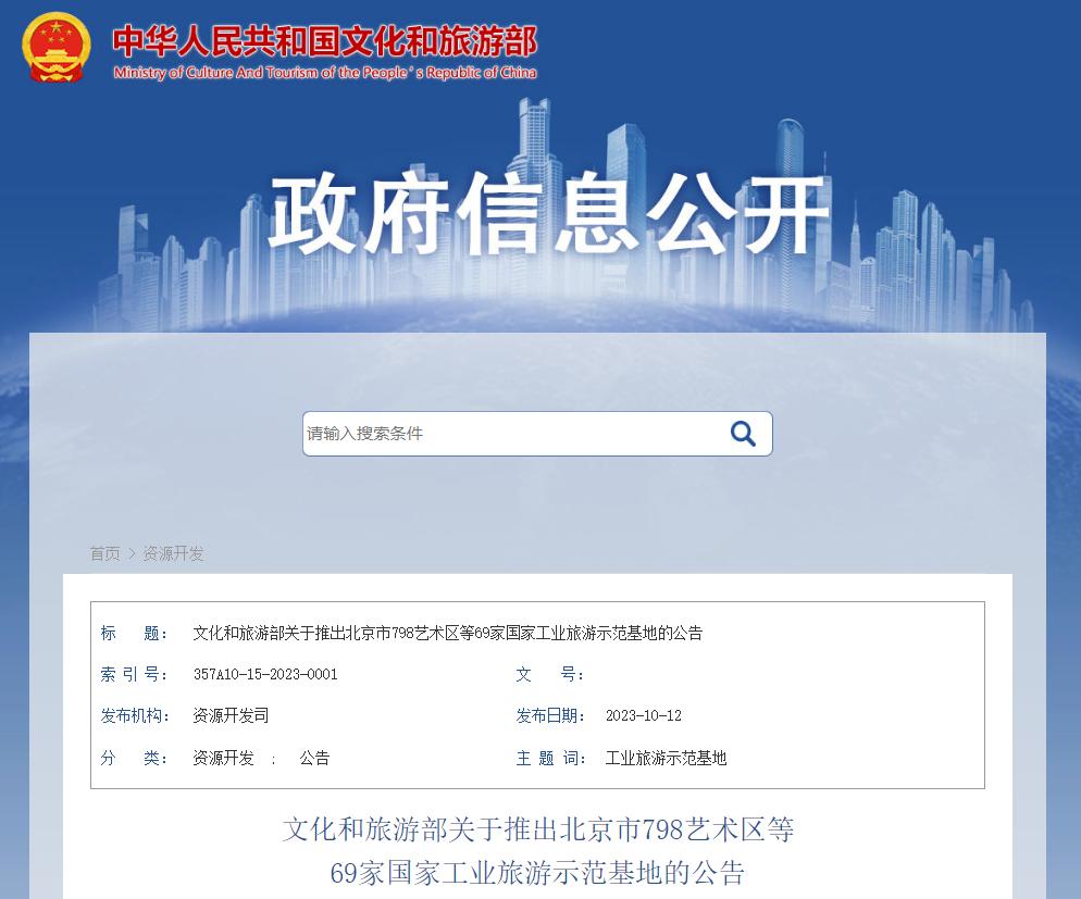 根据《国家工业旅游示范基地规范与评价》行业标准,经有关省(区、市)文化和旅游行政部门推荐,文化和旅游部按程序组织专家评审并进行公示,确定北京市798艺术区等69家单位为国家工业旅游示范基地。