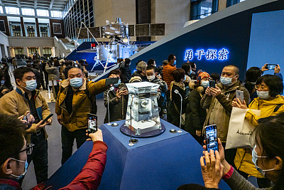 ▲2021年3月2日,公众在国家博物馆近距离观看100克月壤实物。