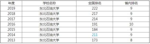 看到上述的介绍之后,相信大家对东北石油大学应该有所了解了,这所大学到底值不值得报考呢?社会认可度怎么样?根据中国校友会团队发布的2019中国大学排行榜可知,东北石油大学最新全国排名第222名,相较于2018年排名第217名,排名下降了4位。而且近些年来该校的排名一直处于下降的趋势。在黑龙江省排名第9名,以下是东北石油大学在全国和黑龙江省内历年具体排名情况,供大家参考。
