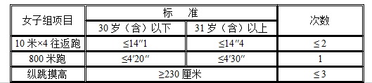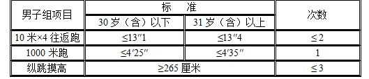 2.体能测评按照《公安机关录用人民警察体能测评项目和标准(暂行)》(人社部发〔2011〕48号)等文件规定的程序、项目、标准和次数组织实施。体能测评项目、标准和次数为: