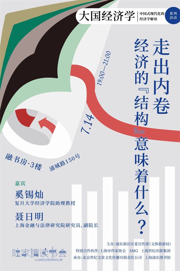 从高速增长转变为高质量增长的变轨时期,中国的社会经济正面临着多重的变革与挑战。有哪些问题是既有的资源配置所决定的,有哪些问题是现实与观念不符导致的,有哪些问题的解决是受到机制体制影响的,还有哪些问题是由于个人、群体、社会、市场以及国家的视角错置所产生的?思考如何再次走出“内卷”,就要思考当我们谈论经济的“结构”时,我们在谈论什么?周五晚,我们邀请到复旦大学经济学院助理教授奚锡灿与上海金融与法律研究院研究员、副院长聂日明两位老师,为我们带来“走出内卷:经济的‘结构’意味着什么?”专题对话,这也是本月陆家嘴读书会“大国经济学:中国式现代化的经济学解释”主题月系列活动的第二场。