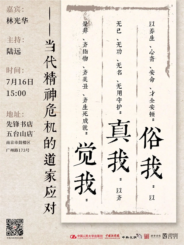 在生活节奏如此之快的现代社会,大多数人都承担着来自工作、生活的各种压力,紧张、焦虑、抑郁、迷茫,与自己的本心渐行渐远。如何才能在现代社会中找回真正的自我,找到最佳的生活状态,找到人生的意义、目标和价值?7月16日,我们将邀请来自中国人民大学国学院的林光华副教授来到先锋书店五台山总店,通过讲座与大家探讨这个问题。