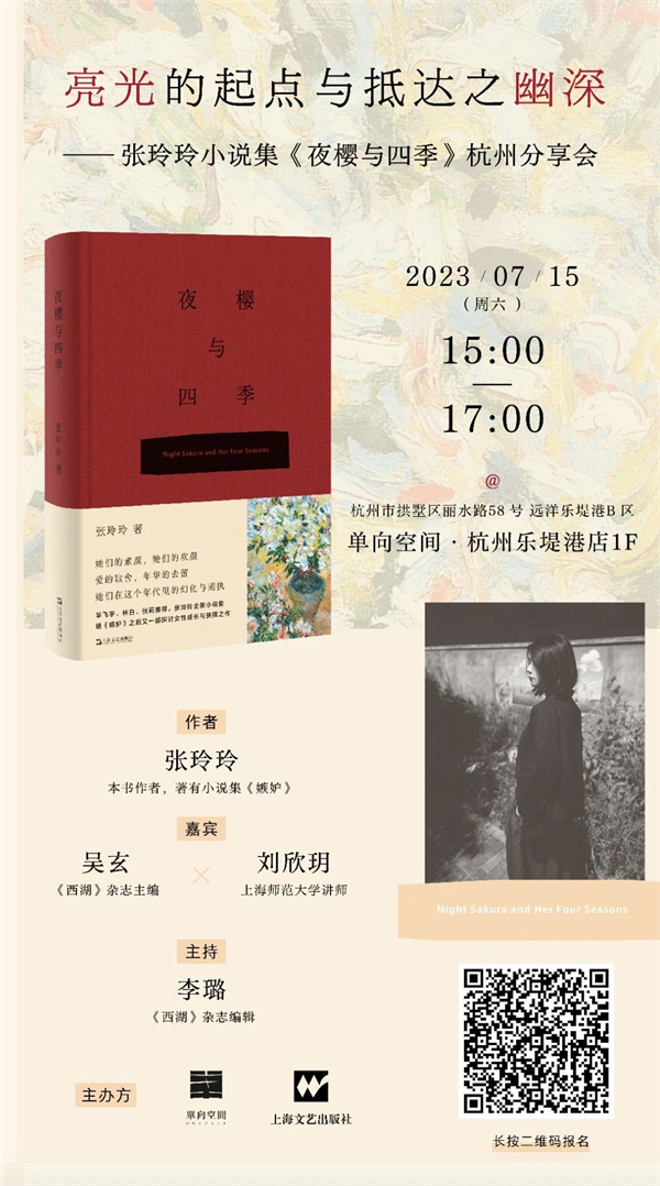 2020年,曾任财经记者的作者张玲玲,告别七年职场生涯,离开上海,旅居不同地方,并最终回到生命前十七年所在的江苏,真正开始全职写作者的生活,因而催生出最新小说集《夜樱与四季》。7月15日,张玲玲将携新书回到自己的写作起点杭州,与《西湖》杂志主编吴玄和上海青年评论家刘欣玥一起,做客单向空间·杭州乐堤港店,和读者们分享小说中她们的时序,他们的季节,谈论关于写作的亮光起点,与小说所能抵达之幽深。