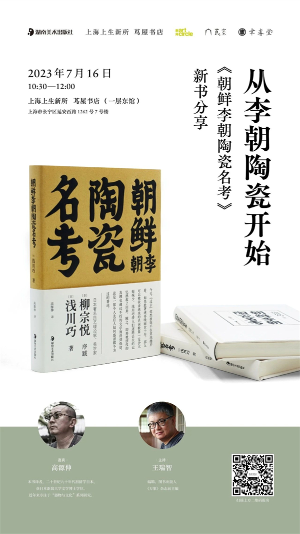 近几年,质朴、纯粹、粗糙的朝鲜李朝陶瓷,越来越受到大家的青睐。《朝鲜李朝陶瓷名考》的作者浅川巧是朝鲜民间工艺和陶瓷器的学者与评论家。他与兄长浅川伯教不仅收集了很多民间生活实用器具、古家具,更是对陶瓷一往情深,走街串巷,从古董店和杂货店中找寻有一定年份和具有代表性的器物,且遍访了半岛的名山大川中每一处窑址,收集了一些残器乃至碎片,对它们进行辨识、整理、归类、研究,经过十多年的努力,终于逐步厘清了李朝瓷器的大致生产脉络和用途分类,于1931年出版《朝鲜陶瓷名考》。7月16日上午,我们邀请《朝鲜李朝陶瓷名考》的译者高源伸与图书出版人、“从民艺开始”系列图书策划人王瑞智做客上生新所茑屋书店,与大家一起“从李朝陶瓷开始”,开启《朝鲜李朝陶瓷名考》的新书分享。
