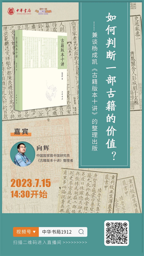 已故古籍鉴藏与研究专家杨成凯先生认为,古籍不仅作为一种物质载体,具有丰富的文化内涵,它还作为一种赏心悦目的艺术形式,丰富了我们的文化生活。鉴赏和研究古籍,可以提高我们的文化素养,增强我们的文化自信。在近期由中华书局出版的《古籍版本十讲》中,杨先生以深厚的学识和睿智的见解,为普通读者讲述古籍版本知识及其背后的故事。本周六下午,我们邀请国家图书馆研究馆员、《古籍版本十讲》整理者向辉先生,做客中华书局线上直播间。向辉先生将从书中的精彩篇章《古籍的价值观》讲起,结合图片为读者讲解如何判断一部古籍的价值,并分享他整理《古籍版本十讲》的心得体会。