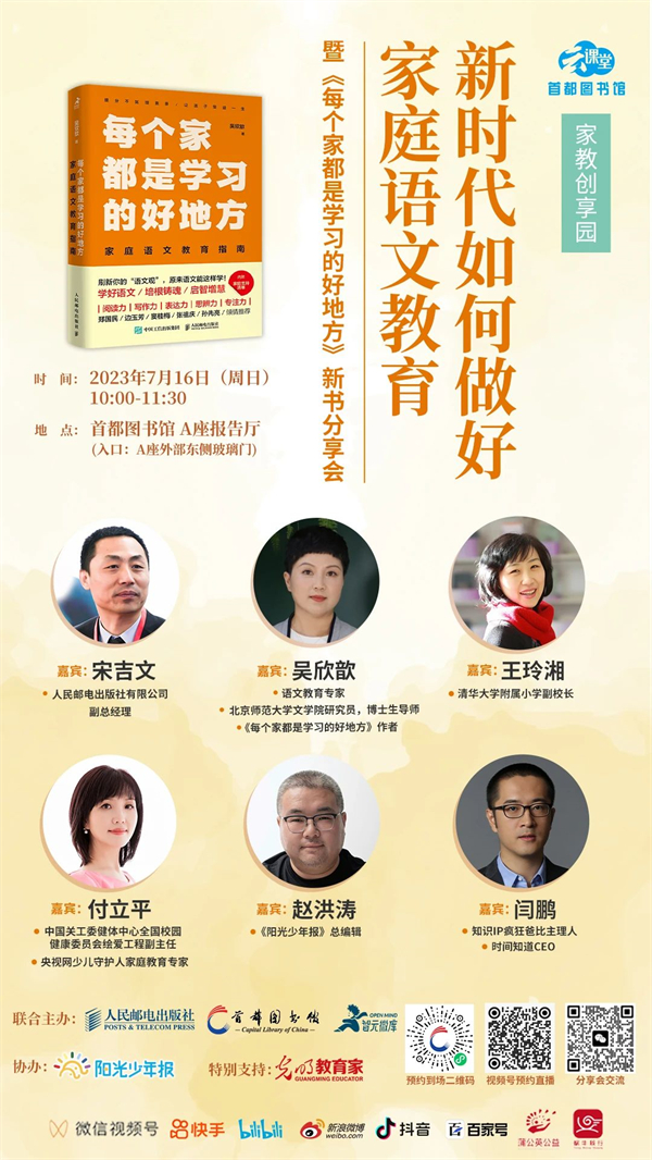 7月16日,首都图书馆邀请语文教育专家吴欣歆老师,携新书《每个家都是学习的好地方:家庭语文教育指南》对谈清华大学附属小学副校长王玲湘,中国关工委健体中心全国校园健康委员会绘爱工程副主任、央视网少儿守护人家庭教育专家付立平,《阳光少年报》总编辑赵洪涛,知识IP疯狂爸比主理人、时间知道CEO闫鹏,共同探讨新时代如何做好家庭语文教育。活动将围绕寻找“人生之书”、营造家庭语言环境、优化家庭生态系统、做好整本书阅读、学好看图写话、实现创意表达等主题展开,探讨如何建设良好的家庭学习环境、家庭生态环境,为广大家长引导孩子学好语文、提升核心素养指明路径。推动社会形成语文学习的共识、形成家庭学习的共识。