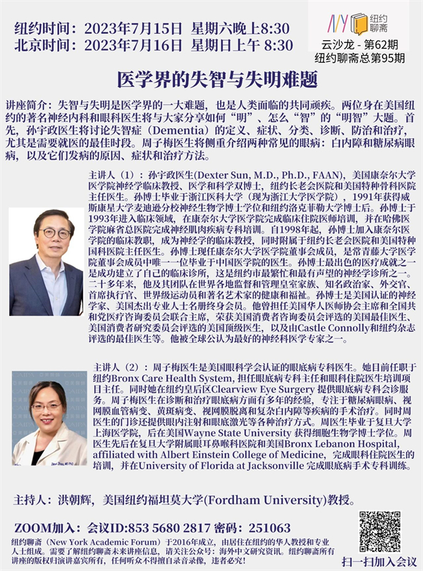 失智与失明是医学界的一大难题,也是人类面临的共同顽疾。两位身在美国纽约的著名神经内科和眼科医生将与大家分享如何“明”、怎么“智”的“明智”大题。首先,孙宇政医生将讨论失智症(Dementia)的定义、症状、分类、诊断、防治和、治疗,尤其是需要就医的最佳时段。周子梅医生将侧重介绍两种常见的眼病:白内障和糖尿病眼病,以及它们发病的原因、症状和治疗方法。