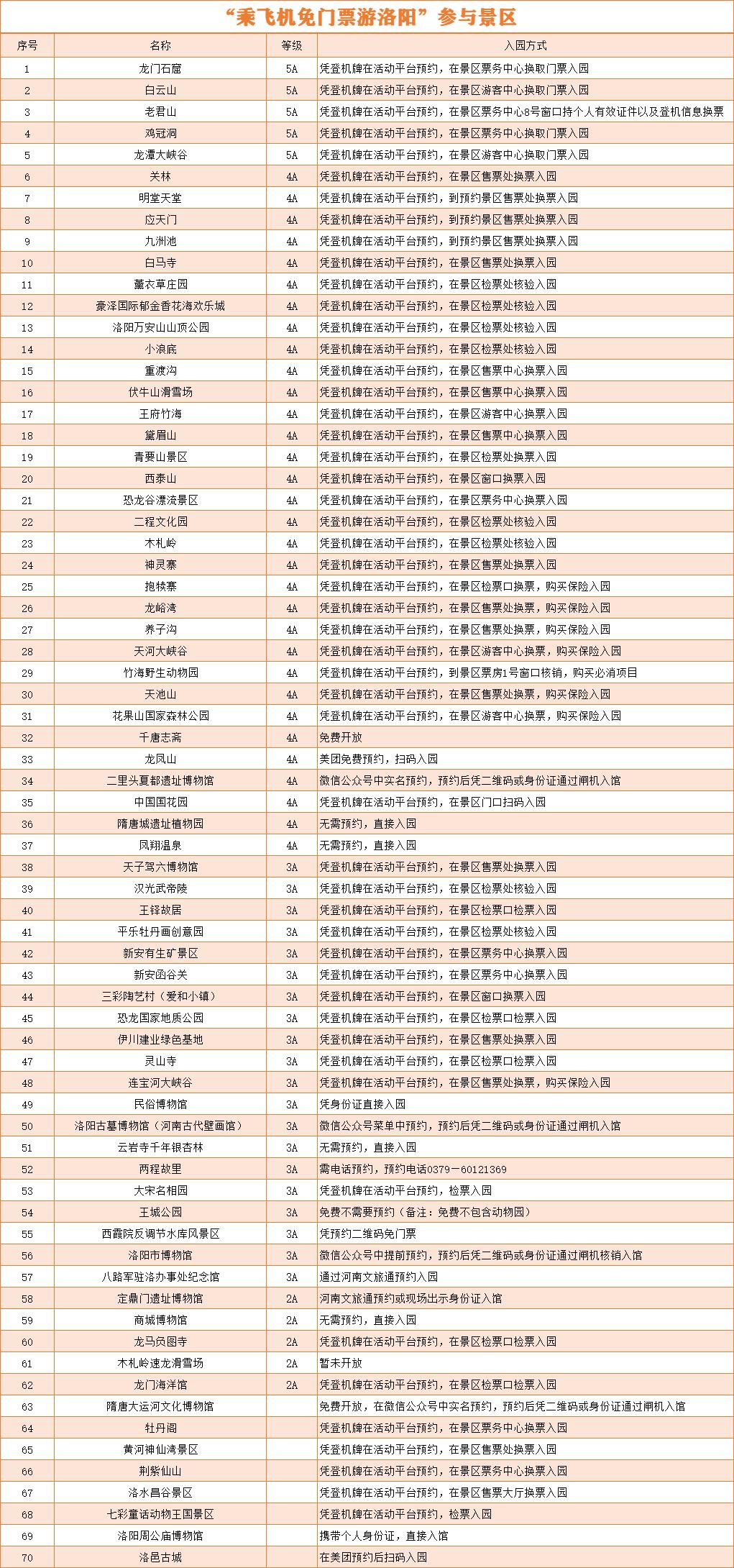 2023年7月18日起至2023年12月31日,洛阳市推出“乘飞机免门票游洛阳”活动,乘坐抵达洛阳机场航班的乘客,在抵达洛阳后10天内(含当天),凭登机牌(纸质/电子)通过预约全市70家旅游景区的首道免费门票畅游洛阳。