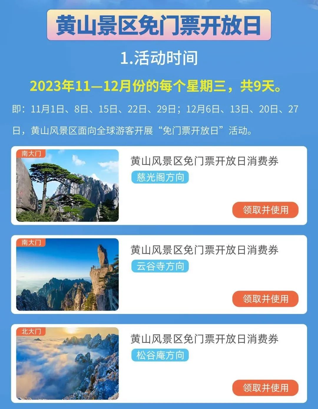 2.选择黄山风景区“免门票开放日”对应入园方向的消费券,点击“领取并使用”进入门票预订页面;