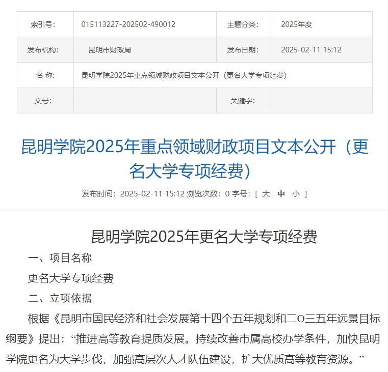 2月11日,昆明市财政局发布:昆明学院2025年重点领域财政项目文本公开(更名大学专项经费)。根据《昆明市国民经济和社会发展第十四个五年规划和二O三五年远景目标纲要》提出:“推进高等教育提质发展。持续改善市属高校办学条件,加快昆明学院更名为大学步伐,加强高层次人才队伍建设,扩大优质高等教育资源。”