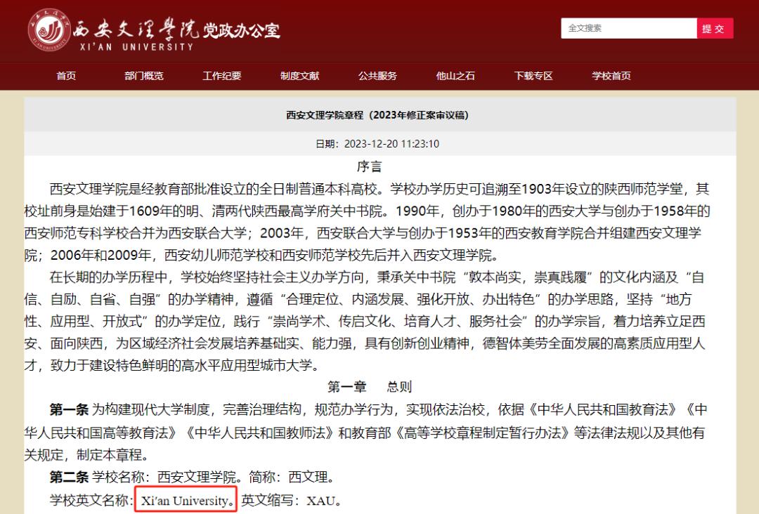 溯源西安文理学院校史,依稀能发现西安大学的身影。西安文理学院是2003年4月由西安联合大学与西安教育学院合并组建而成,而西安联合大学是1990年由西安师范专科学校(创建于1958年)与西安大学(创建于1980年)合并而成。更为巧妙的是,西安文理学院的英文名为“XI’AN UNIVERSITY”,正是西安大学的意译。