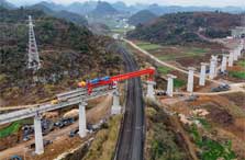 当日,在贵州省安顺市境内,作业人员操纵架桥机,将重约135吨的32米T梁成功架设在斗篷山特大桥30-31号桥墩间。新建沪昆铁路至安六铁路客车联络线成功上跨既有沪昆铁路,工程建设取得进展,为项目早日建成通车奠定基础。