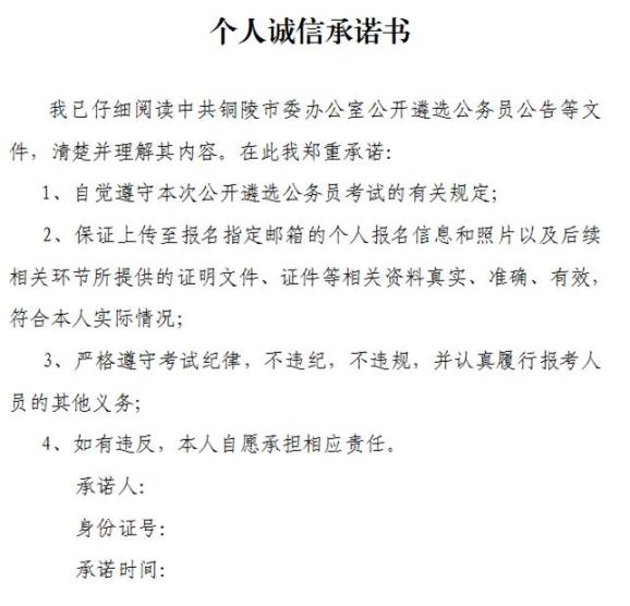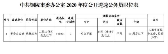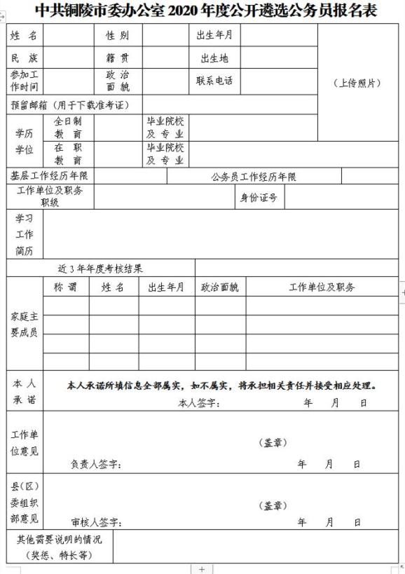 2020年4月7日在铜陵先锋网()发布遴选公告和职位表,以及《中共铜陵市委办公室2020年度公开遴选公务员报名表》(以下简称《报名表》)、个人诚信承诺书(见附件2、3)。