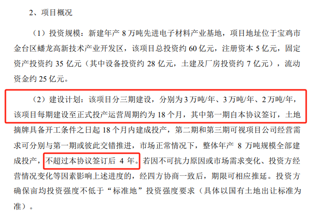 其中,中一科技一期出资3.25亿元,二、三期具体投资方式需根据公司与交易对手方具体协商确定,相应需公司实际投入的资金尚未确定。第二期和第三期可视项目公司经营需求分别与第一期或彼此交错推进,市场正常情况下,整体年产8万吨规模全部建成投产,不超过本协议签订后4年。
