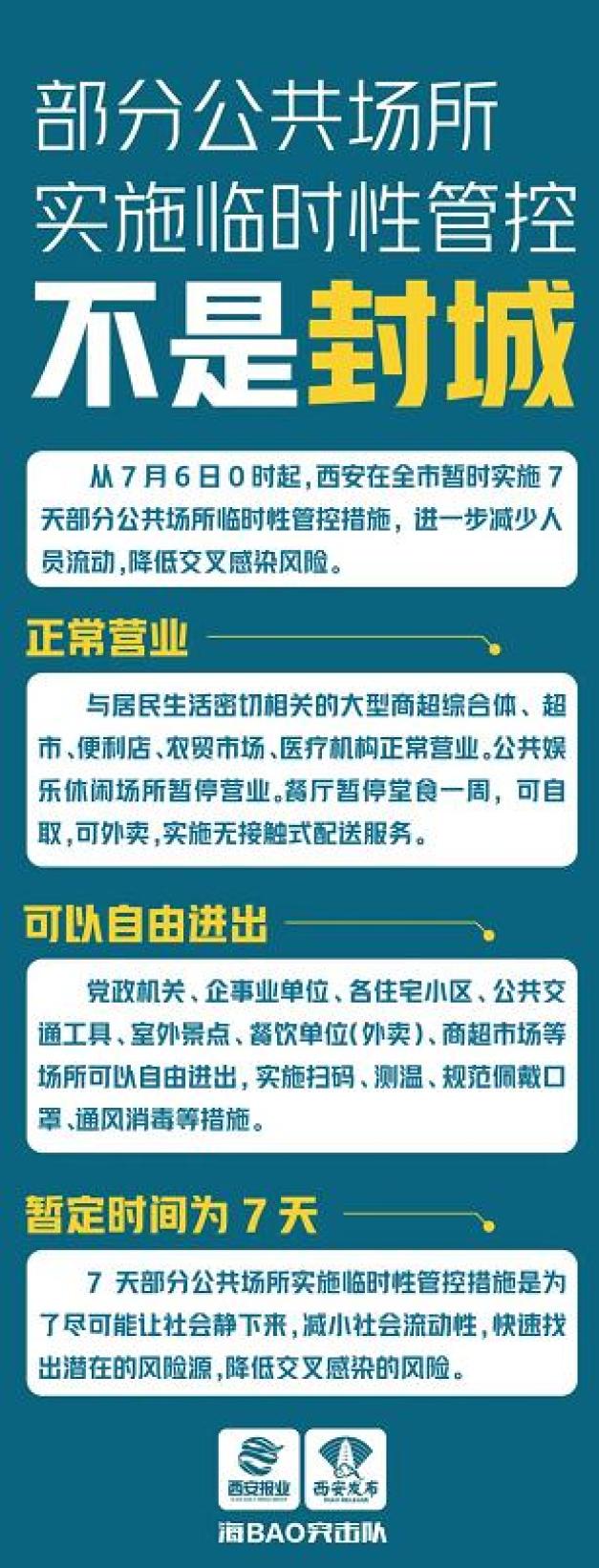 6.西安“封城”?当地最新回应:7月6日0时起,西安在全市暂时实施7天部分公共场所临时性管控措施。西安市疫情防控指挥部有关负责人表示,部分公共场所实施临时性管控,不是“封城”。与居民生活密切相关的大型商超综合体、超市、便利店、农贸市场、医疗机构正常营业。公共娱乐休闲场所暂停营业,餐厅暂停堂食一周。(中国新闻网)