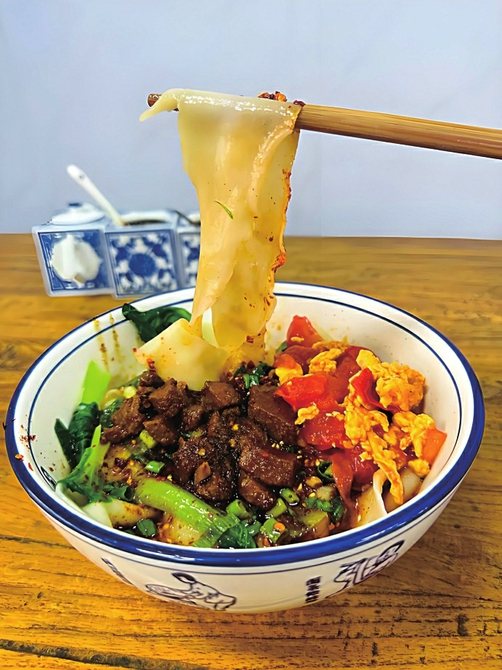 第三样是裤带面。裤带面还有一个称呼是“BiángBiáng面”,因为制作过程中发出类似的声音而得名,是陕西八大怪之一。面条宽如裤带,配上特制的油泼辣子,热气腾腾的面香和辣香让人还未吃到就口水直流。面粉是来自关中冬小麦所磨之面,所以这道美食来西安吃才能吃到最地道的口味。比起羊肉泡馍的咸鲜和甑糕的香甜,裤带面多了几分属于陕西人的刚烈,关于裤带面的传说典故中,其中之一说的就是秦兵爱吃裤带面。今天,游客喜爱的吃法则是一碗加了油泼辣子、西红柿鸡蛋、肉、剁椒等配菜的丰盛的面,再来一瓶冰峰汽水。裹满料的宽面,配生蒜一起吃,碳水极致的快乐愿望就实现了。