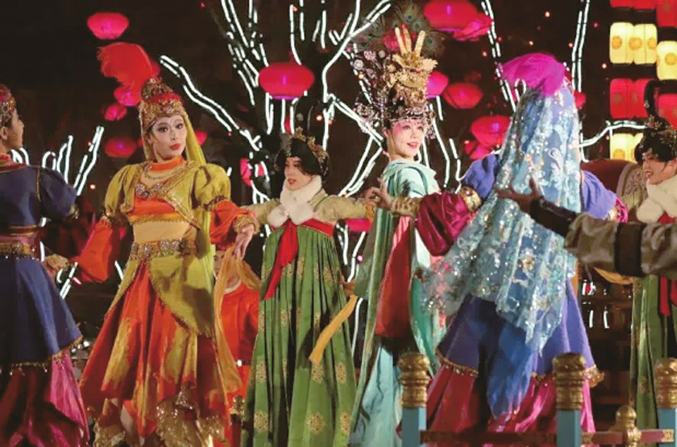 有才华的游客可以在《盛唐密盒》处举手示意,与演员互动;喜欢李白的游客可以在《诗歌艺术》处与李白 对诗;《花车 斗彩》处西域胡姬与大唐美女现场斗舞,彰显盛唐时期丝路文化和盛唐文化的和谐交融,仿佛到了古装电视剧中的上元节;《贞观之治》处则可感受李世民时期万国来朝贺的盛世景象;一路有行为艺术,《武士雕刻》《奋斗在路上》《画中人》《戏演壁画》等让人目不暇接,一路走走停停,到达最南端的开元广场,就可以看一场大唐不夜城场地最大、演员最多、时间最长的表演《再回长安》,感受大诗人白居易回长安的盛大氛围;开元广场东侧不倒翁小姐姐表演,周围也围着很多游客,不远万里前来一睹小姐姐美丽的身姿。