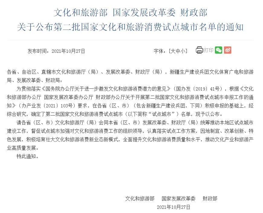 10月27日,国家文化和旅游部、发展和改革委员会、财政部公布了第二批国家文化和旅游消费试点城市名单,连同宝鸡在内的55个城市成功入选。