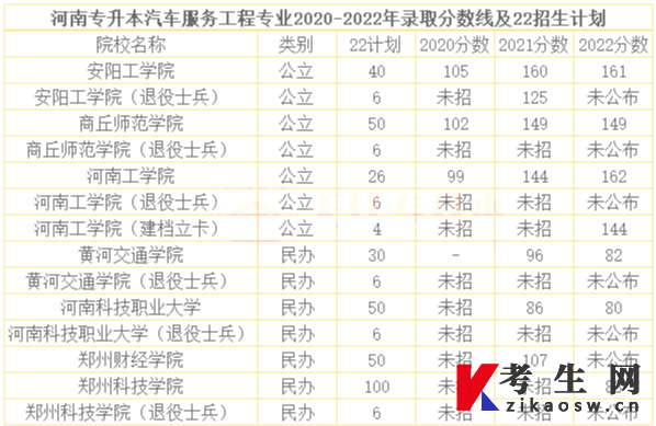 河南汽车服务工程专业专升本2023年专升本有哪些院校选择呢?给考生整理了汽车服务工程专业最近三年(2020-2022)的数据作为参考。详情见下文: