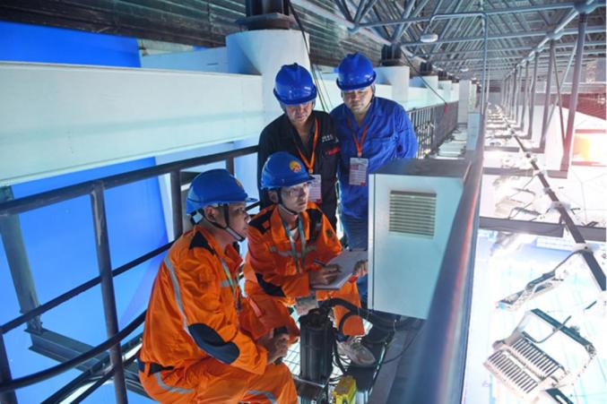 成都大运会电力保障团队队员在简阳市文体中心对跳水比赛场馆巡检设备