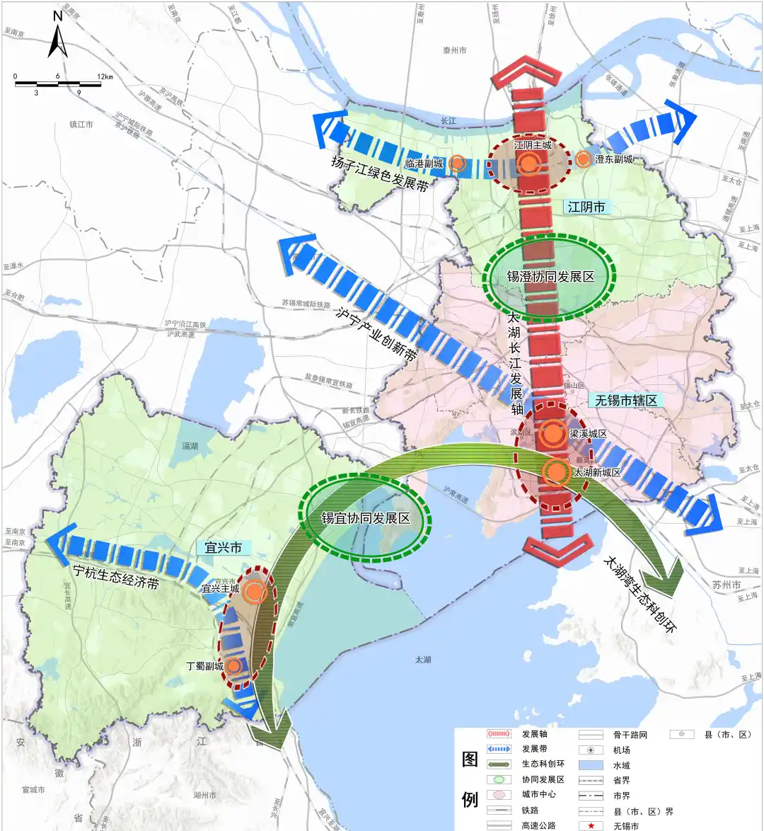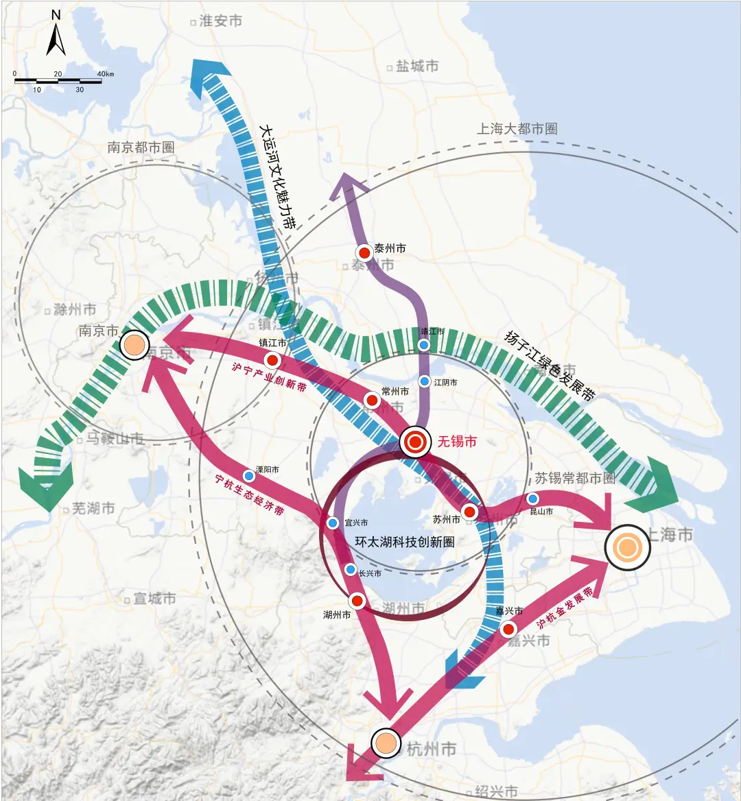 《规划》明确,无锡要落实长江经济带发展、长三角一体化发展国家战略和扬子江绿色发展带、苏锡常都市圈等省级战略部署,东向接轨融入上海大都市圈,西向共建环太湖世界级魅力湖区,南向协同联动宁杭生态经济带建设,北向引领辐射锡常泰跨江发展,通过生态共保、科创共赢、设施共建、文化共荣等,推进跨区域空间协同,构建区域协调发展新格局。