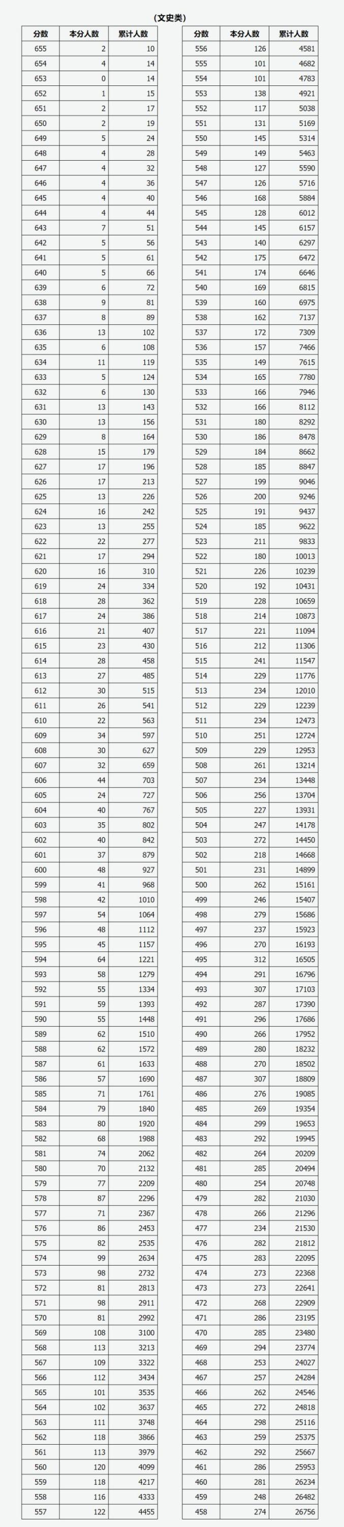 文科600分以上927人,550分以上5314人。本科一批最低控制分数线以上6297人,本科二批最低控制线以上26756人。