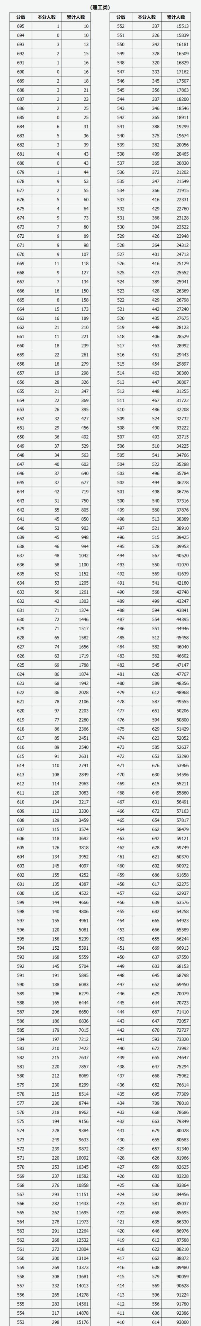理科600分以上4522人,550分以上16181人。本科一批最低控制分数线以上34766人,本科二批最低控制分数线以上93000人。