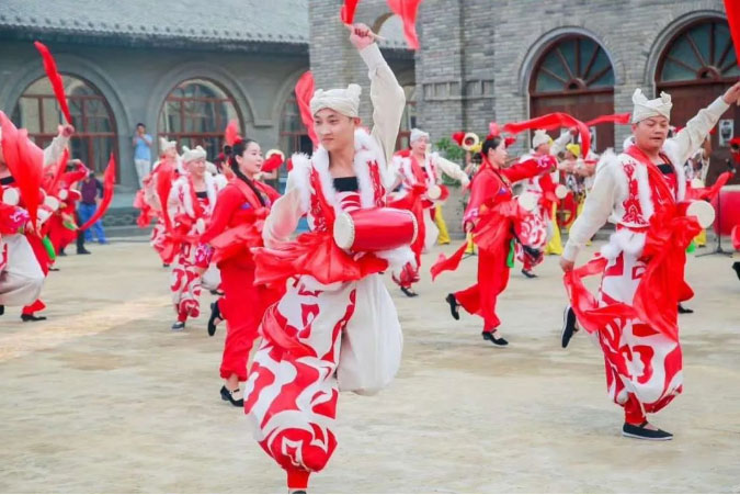 中午大家在教堂门口可以感受到陕北人民妞秧歌的热情以及军民大生产的艰辛,在南街大树下有别具风味的二胡、说书等表演,当然也少不了延安代表性的腰鼓表演,随着腰鼓声音能够激动人心,让大家也忍不住随着演员一起跳起来。穿梭在南北街区也能观赏到熟悉的川剧变脸、扣人心弦的街头杂耍、直击灵魂的古典音乐。同时您还能品尝到特色的延安美食:延安沾沾、羊杂碎、碗托等特色美食,保证让您能够大快朵颐、流连忘返。