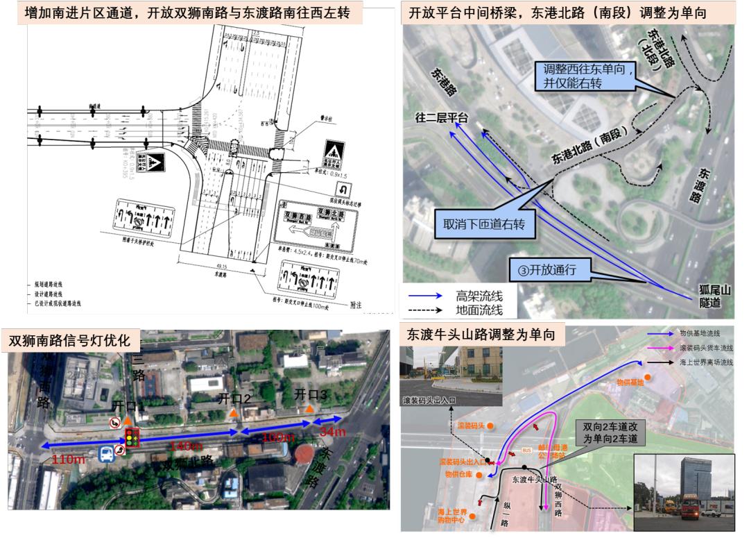 采用南往北单向通行,优化双狮北路、东渡牛头山路、东港北路局部路段的交通组织,严格管控、取消东港路、东港北路、东港一路路侧随意停车,提高道路的通行效率。