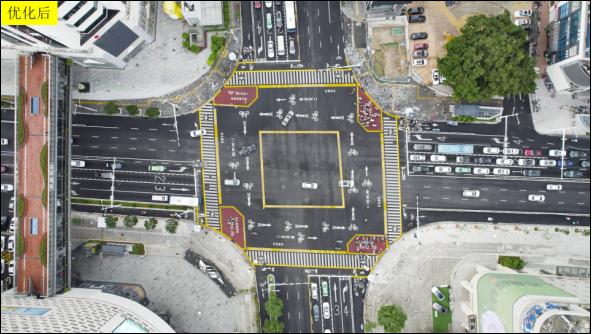 ①重新施划地面标线,优化出口道,缩减渠化岛,使得右转车辆的行车路线更加顺畅;扩展现有西北侧的非机动车道,便于非机动车通行。