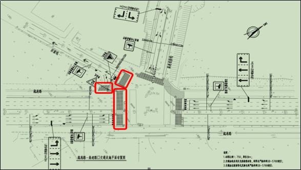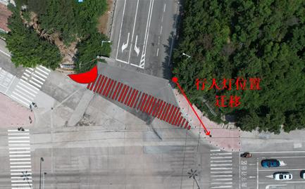 在北进口右侧增设行人驻足岛保障行人等待安全,将行人斑马线及行人灯进行位置调整,方便行人观察信号灯,保障行人过街。